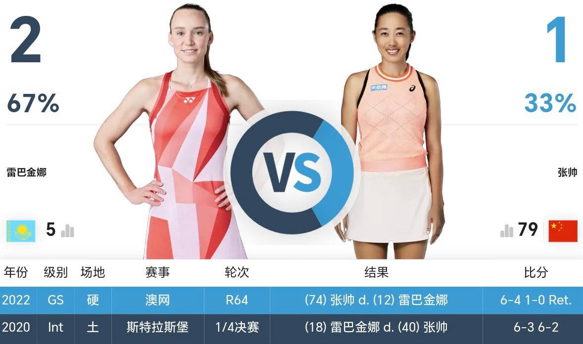 虽然两人的排名差距明显,但从过往交手纪录来看,张帅并非没有可乘之机。她们此前仅在2022年澳网第二轮相遇,当时张帅占据优势时对手因伤退赛。此外,莱巴金娜赛前透露脚部仍有隐痛,也为比赛增添悬念。